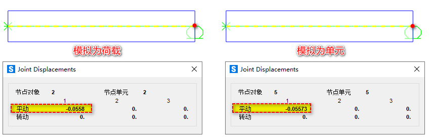 如下圖所示,兩個(gè)完全相同的預(yù)應(yīng)力混凝土簡支梁,左側(cè)模型中的鋼束采用荷載模擬,右側(cè)模型則采用單元模擬。對鋼束施加相同的預(yù)應(yīng)力,兩者均未考慮預(yù)應(yīng)力損失。請問,采用荷載和單元模擬預(yù)應(yīng)力鋼束時(shí),二者引起的構(gòu)件軸向變形為什么略有不同呢?