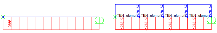 對于左側(cè)模型,鋼束面積 200mm2,兩端張拉力均為 10000N/mm2,無預(yù)應(yīng)力損失情況下其施加預(yù)拉力為200*10000*0.001=2000KN,對應(yīng)梁端的壓力也為 2000KN。預(yù)應(yīng)力工況下梁的軸力圖如下所示,可以看到左側(cè)模型梁端施加的預(yù)應(yīng)力為 2000KN,與計(jì)算相符。
