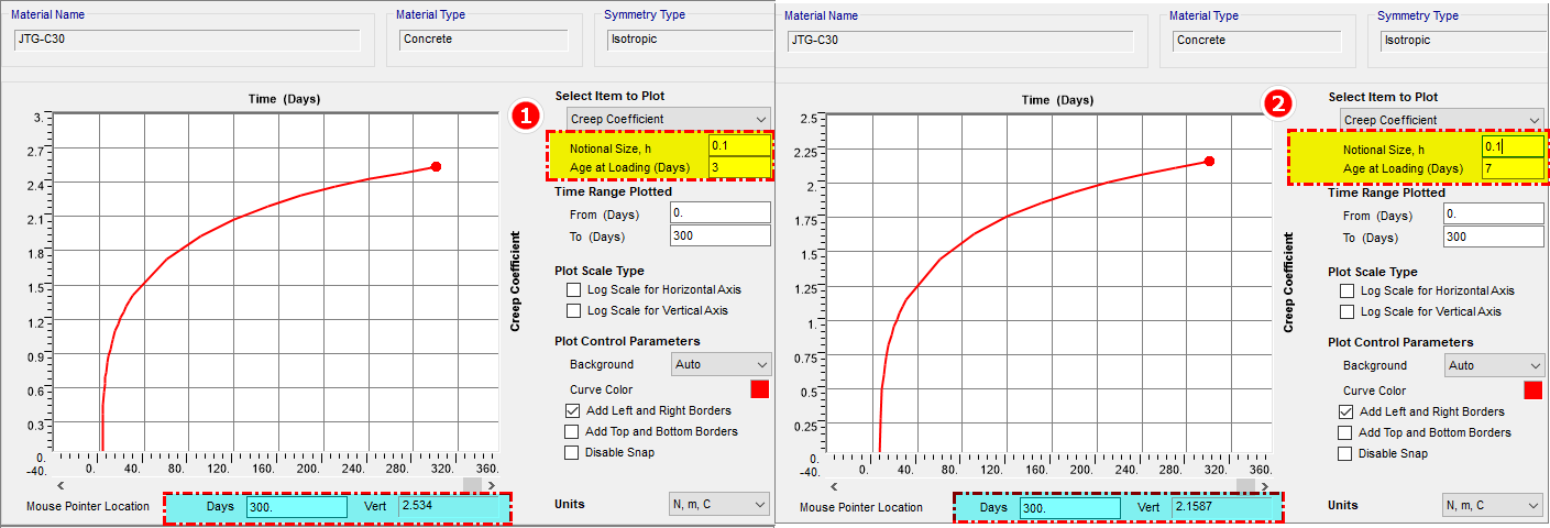 如下圖所示,混凝土為 C30,構(gòu)件的名義尺寸為 0.1m,分別取施加荷載時(shí)混凝土的添加齡期為 3(Day) 和 7(Day)。查看第 300 天的徐變系數(shù),可以看到混凝土的添加齡期為 3(Day) 時(shí),徐變系數(shù)為 2.534;混凝土的添加齡期為 7(Day) 時(shí),徐變系數(shù)為 2.1587,兩者不同。