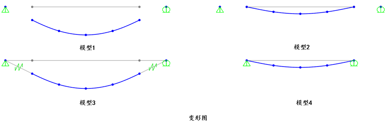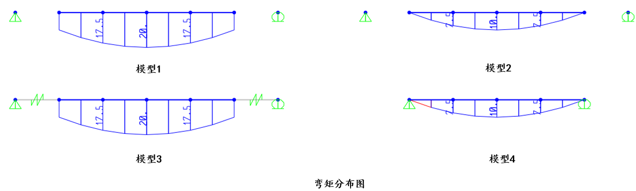 現(xiàn)在通過下圖中的簡支梁模型來簡要介紹這兩個約束的區(qū)別。對簡支梁指定 5kN/m 的均布荷載,支座約束條件相同,現(xiàn)在分別采用四種方式和支座相連。