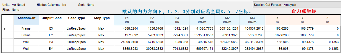 results】>【Structure Output】>【Other Output Items】>【Section Cut Forces】中,便可以看到任意工況下框架或剪力墻部分承擔(dān)的剪力和傾覆力矩,比如在EX工況下,查看F1和M2即可。