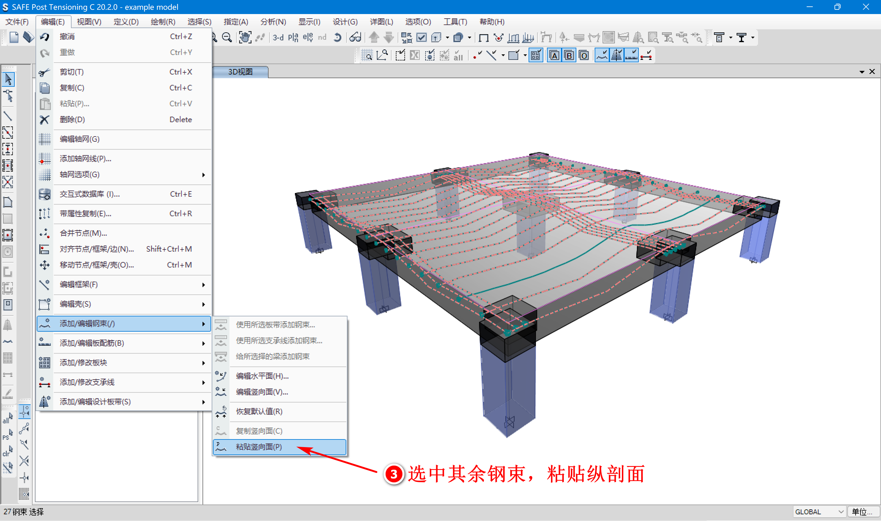 SAFE中批量修改預(yù)應(yīng)力鋼筋縱剖面是通過(guò)【復(fù)制縱剖面】和【粘貼縱剖面】?jī)蓚€(gè)命令結(jié)合的方式實(shí)現(xiàn)的。注意,ETABS也具有此功能,且操作是相同的。具體操作步驟和注意事項(xiàng)如下: