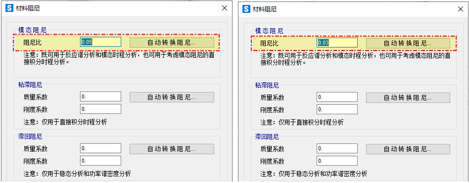 分析時程序首先會將材料阻尼轉(zhuǎn)化為“復(fù)合模態(tài)阻尼”,得到結(jié)構(gòu)各個振型下的阻尼。確定各階模態(tài)阻尼后,程序?qū)⒏鶕?jù)模型實(shí)際阻尼和反應(yīng)譜函數(shù)的阻尼,自動調(diào)整反應(yīng)譜函數(shù)值,使反應(yīng)譜函數(shù)對應(yīng)的阻尼與模態(tài)阻尼一致。并依據(jù)調(diào)整后的曲線確定各階振型的地震影響系數(shù),計(jì)算出各階振型的地震力。反應(yīng)譜曲線的調(diào)整方式可以參考知識庫文章“函數(shù)阻尼比vs 模態(tài)阻尼比”。