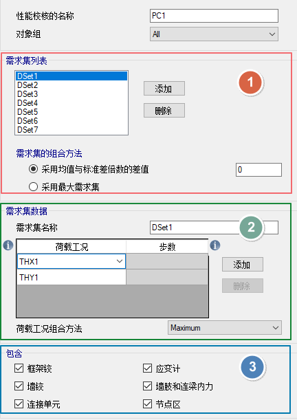 首先,在區(qū)域①定義一系列需求集,在區(qū)域①需求集列表的下方可以定義不同需求集的組合方式:取多個需求集的“均值+n倍標(biāo)準(zhǔn)差”或“最大值”。對應(yīng)中國規(guī)范的規(guī)定,可以用不同的需求集表示不同地震波的輸入。當(dāng)有三組地震波輸入時,宜取包絡(luò)值,即在“需求集的組合方法”中選擇“采用最大需求集”;當(dāng)有七組地震波輸入時,宜取平均值,即在“需求集的組合方法”中選擇“采用均值與標(biāo)準(zhǔn)差倍數(shù)的差值”,并在后方的空格中輸入0,表示取0倍標(biāo)準(zhǔn)差。