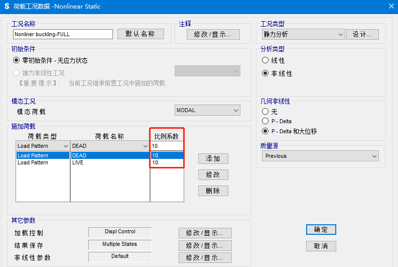 當采用力控制時,程序?qū)凑罩付ǖ摹氨壤禂?shù)”施加荷載,直至計算無法收斂。計算完成后,程序輸出的荷載倍數(shù)即實際施加在結(jié)構(gòu)上的荷載倍數(shù),無需與工況中的比例系數(shù)同時考慮。
