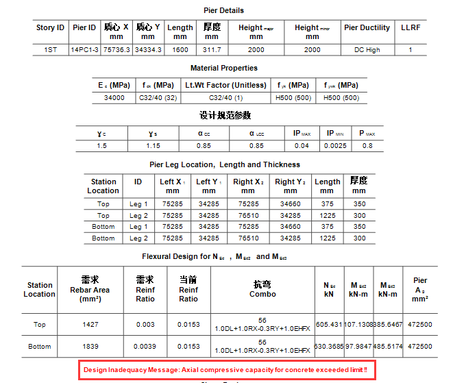 某混凝土框架-剪力墻結(jié)構(gòu),墻體按高延性等級(jí)設(shè)計(jì),設(shè)計(jì)細(xì)節(jié)中出現(xiàn)“超出混凝土軸壓承載力限值"的警告信息(如下圖),但是細(xì)節(jié)中軸力Ned為拉力,且內(nèi)力和配筋結(jié)果很正常,配筋率都在正常范圍內(nèi),請(qǐng)問是什么原因?