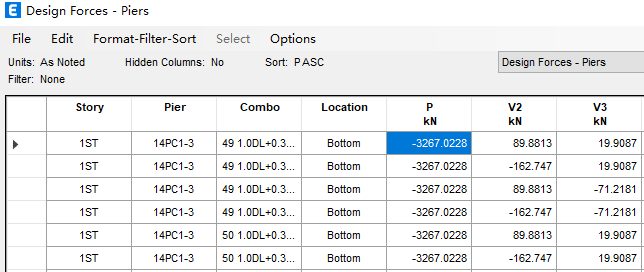 需要注意的是,上述截圖中給出的是正截面承載力校核時(shí)的控制組合和內(nèi)力,并不一定是導(dǎo)致軸壓比超限的那個(gè)設(shè)計(jì)組合,用戶需要在【顯示>顯示表格>Design Data>Design