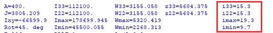 在設計細節(jié)中可以看見,程序輸出了4個回轉(zhuǎn)半徑,分別為對局部2軸的回轉(zhuǎn)半徑i22、對局部3軸的回轉(zhuǎn)半徑i33、對強軸的回轉(zhuǎn)半徑i max和對弱軸的回轉(zhuǎn)半徑i min。