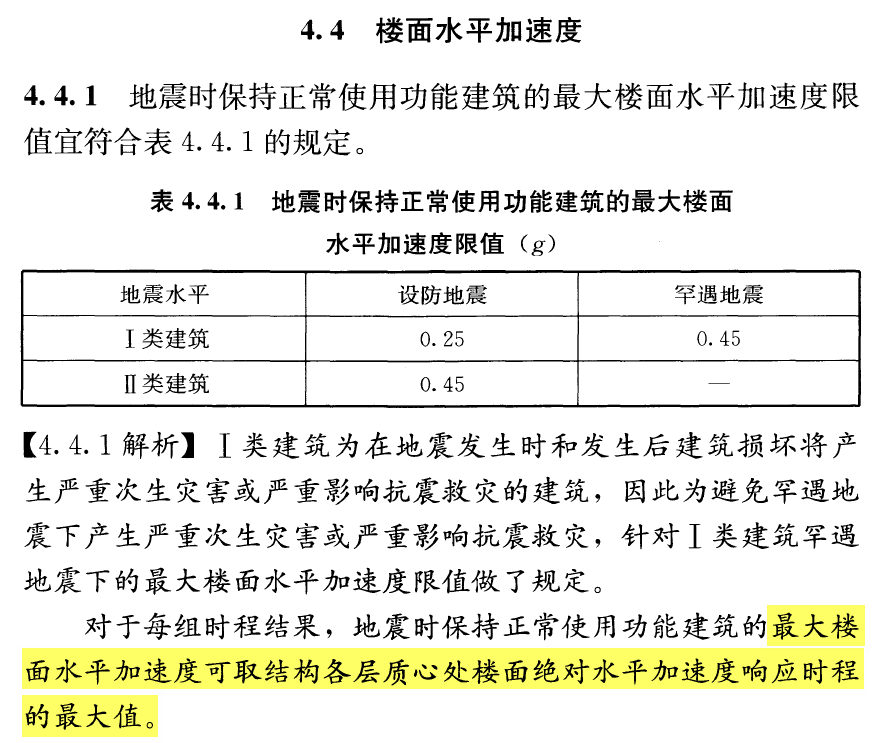 上述【Story Accelerations 】表格輸出樓層最大加速度,也就是樓層范圍內(nèi)所有節(jié)點的最大絕對加速度。根據(jù)《基于保持建筑正常使用功能的抗震技術(shù)導(dǎo)則》RISN-TG046-2023(簡稱《導(dǎo)則》)第 4.4.1 條條文說明,最大樓面水平加速度可取結(jié)構(gòu)各層質(zhì)心處樓面絕對水平加速度響應(yīng)時程的最大值。因此,【Story Accelerations】表格輸出的結(jié)果并不是該規(guī)范要求的樓面加速度,用戶需找到質(zhì)心(附近)處的節(jié)點,查看該節(jié)點的絕對加速度。
