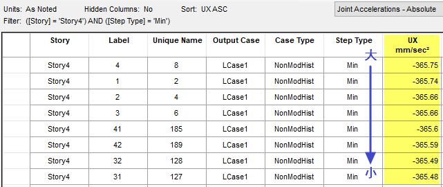 查看第四層所有節(jié)點的絕對加速度(圖 4),需要注意的是,表格中的 max 和 min 表示的是方向,應(yīng)取兩者絕對值的最大值,可以看見最大值為角部 4 號節(jié)點的365.75mm/s2,與“Story Accelerations”中輸出的結(jié)果一致(圖 5),說明表格中輸出的為所有節(jié)點的最大絕對加速度。