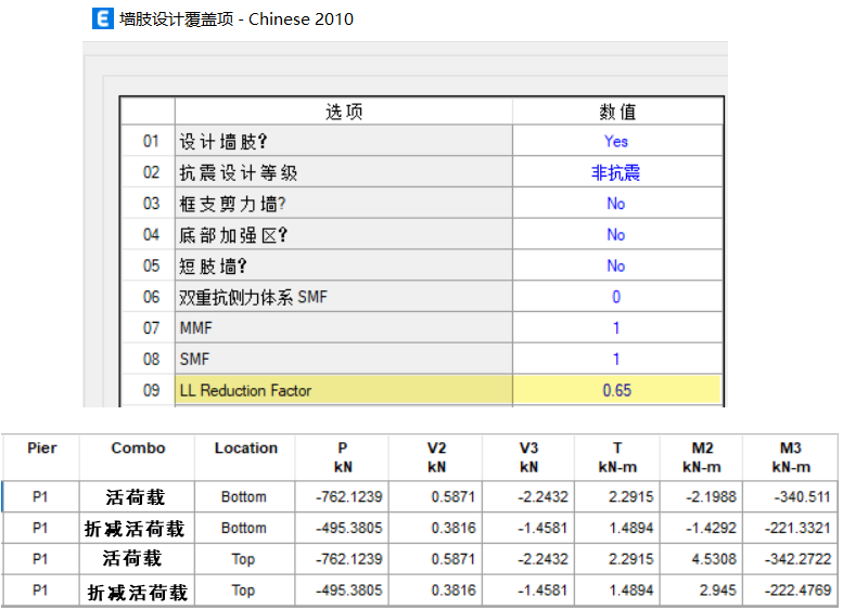 以某六層框-剪結(jié)構(gòu)為例,底層柱和底層墻以上的樓層數(shù)為 6,程序自動(dòng)考慮的活荷載折減系數(shù)和設(shè)計(jì)內(nèi)力如圖 2 和圖 3 所示。