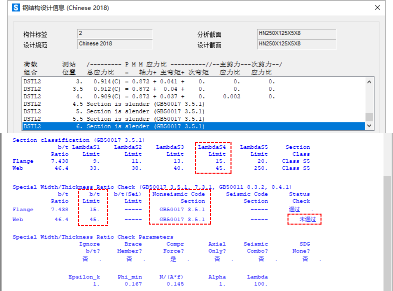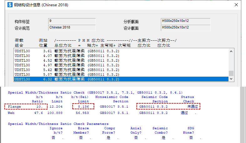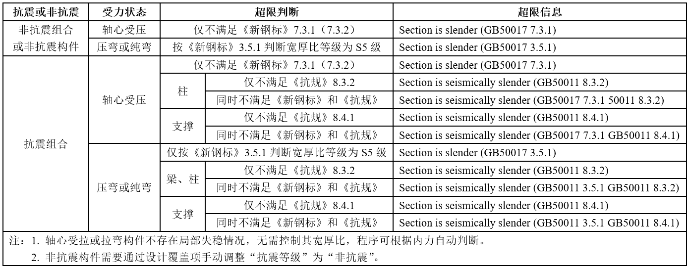 SAP2000中鋼結(jié)構(gòu)板件寬厚比的校核,對于非抗震組合和非抗震構(gòu)件,僅按照《鋼結(jié)構(gòu)設(shè)計標準》GB50017-2017(簡稱“新鋼標”)第3.5.1條、第7.3.1條(第7.3.2條)控制;對于抗震組合構(gòu)件,在新鋼標的基礎(chǔ)上補充按照《建筑抗震設(shè)計規(guī)范》GB50011-2010(簡稱“抗規(guī)”)第8.3.2條、第8.4.1條取包絡(luò)控制。當(dāng)板件寬厚比超過相應(yīng)的限值要求時,程序會在設(shè)計細節(jié)中給出“Section is