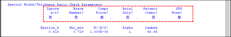 SAP2000 v25.3.0在設(shè)計細節(jié)中新增一行寬厚比校核參數(shù)的輸出,如圖2所示,依次為:是否忽略寬厚比校核(Ignore