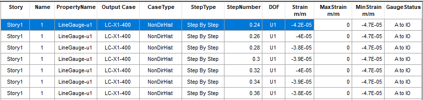 模型計(jì)算完成后,可在【顯示】>【顯示表格】>【Analysis Results】>【Element Output】>【Strain Gauge