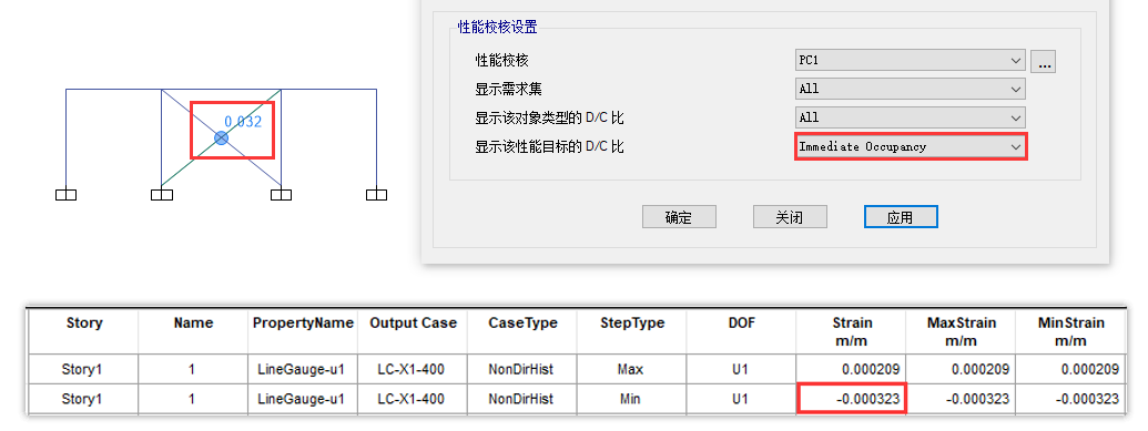 “最大應(yīng)變/可接受準(zhǔn)則”即為相應(yīng)狀態(tài)下的性能校核結(jié)果,本例中最大應(yīng)變?yōu)?.00323,IO狀態(tài)下性能校核結(jié)果為0.00323/0.01=0.032,與程序輸出結(jié)果一致。
