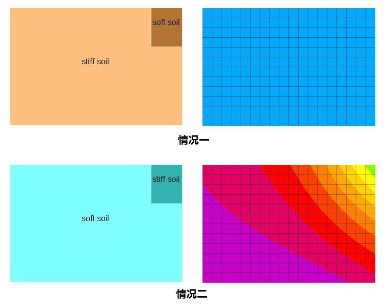 如圖2所示,在情況一中,大板的彈簧剛度較大,重疊區(qū)域的彈簧剛度最終按大板剛度確定,因此在均布面荷載作用下,基礎(chǔ)變形沒有變化。而在情況二中,小板的彈簧剛度較大,重疊區(qū)域的彈簧剛度最終按小板剛度確定,基礎(chǔ)變形因彈簧剛度的不同而有所變化。