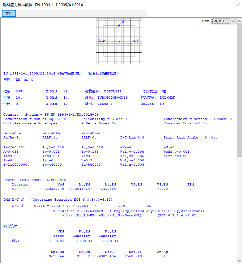 例如,在問題描述的模型中,框架截面名稱包含中文字符,如圖3所示。黃色陰影區(qū)的截面名稱使用了正確的字符格式,包含英文字母和數(shù)字;而綠色陰影區(qū)的截面名稱則包含中文輸入法中的乘法符號“×”。將所有的乘法符號“×”替換為英文字母“X”后,重新運行設(shè)計,查看設(shè)計信息時不再出現(xiàn)報錯提示,設(shè)計結(jié)果也可以正常顯示,如圖4所示。