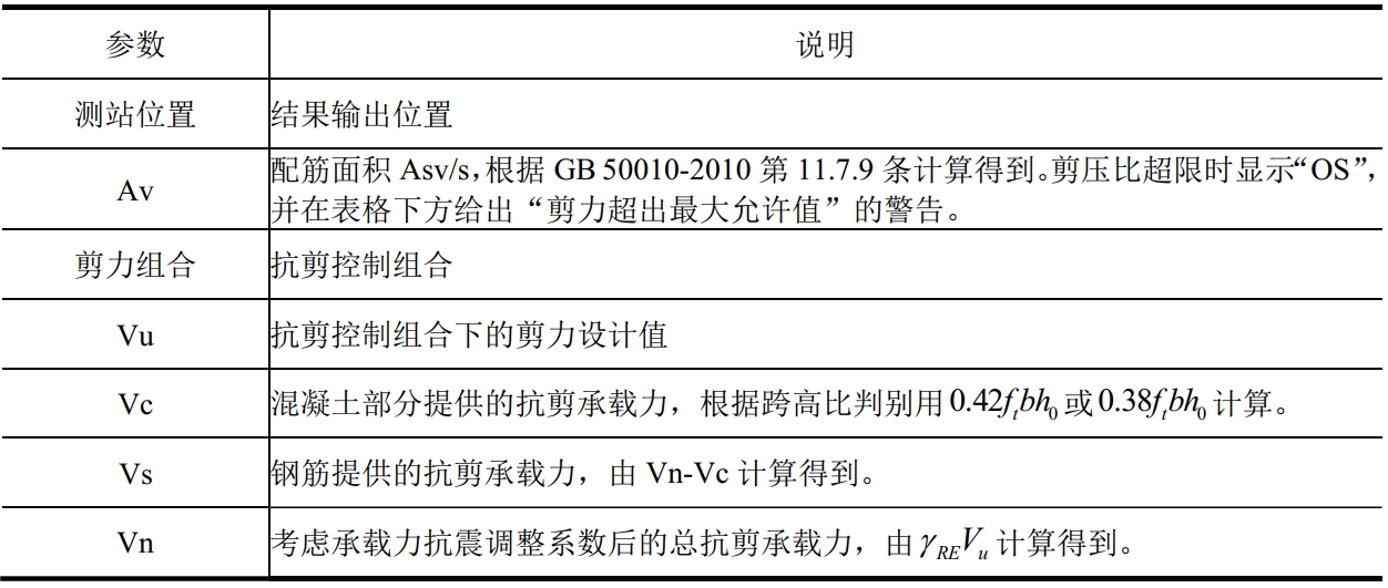 50010-2010第11.7.9條完成連梁的斜截面配筋計算,各項參數(shù)說明詳見下表。