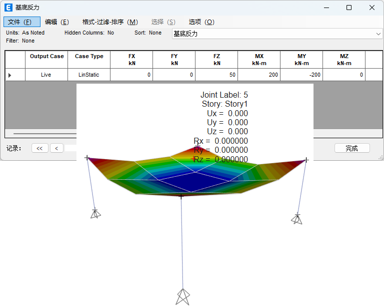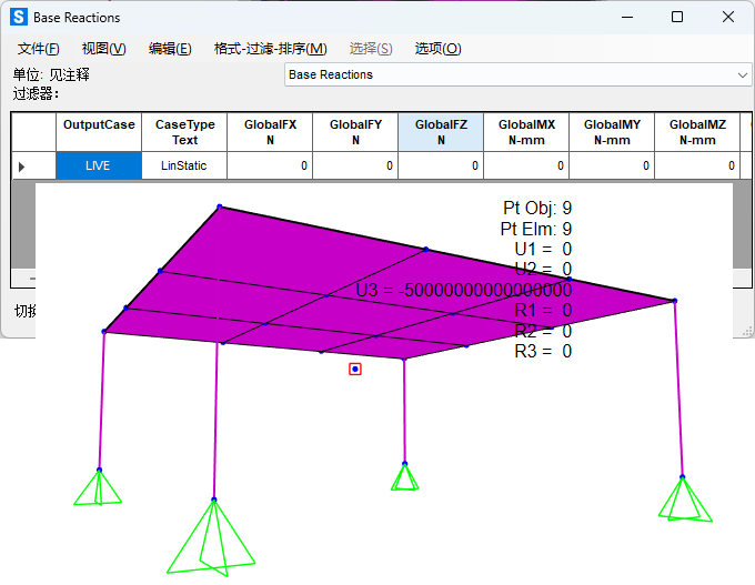 對(duì)圖 1 的兩個(gè)模型運(yùn)行分析,并對(duì)比基底反力和變形圖,結(jié)果表明:SAP2000 中的點(diǎn)荷載未傳遞至面對(duì)象,節(jié)點(diǎn)的位移無(wú)窮大,如圖 2 所示。ETABS 中的點(diǎn)荷載傳遞至面對(duì)象,但未在節(jié)點(diǎn)處產(chǎn)生預(yù)期的應(yīng)力集中現(xiàn)象,荷載似乎被直接平均分配到所包含面單元的四個(gè)角點(diǎn),節(jié)點(diǎn)的位移為零,如圖 3 所示。