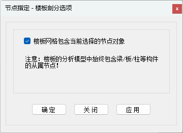 ETABS 默認(rèn)的樓板剖分不包含特殊節(jié)點(diǎn)。如有需要,用戶可在選擇特殊節(jié)點(diǎn)后,點(diǎn)擊【指定>節(jié)點(diǎn)>樓板剖分選項(xiàng)】命令,勾選“樓板網(wǎng)格包含當(dāng)前選擇的節(jié)點(diǎn)對(duì)象”,如圖 4 所示。