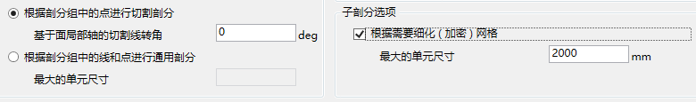 2)點(diǎn)擊【指定>面>自動(dòng)剖分選項(xiàng)】命令,選擇“根據(jù)剖分組中的點(diǎn)進(jìn)行切割剖分”,可以同時(shí)勾選“根據(jù)需要細(xì)化(加密)網(wǎng)格”并指定最大單元尺寸。或者,選擇“根據(jù)剖分組中的線和點(diǎn)進(jìn)行通用剖分”并指定最大單元尺寸。