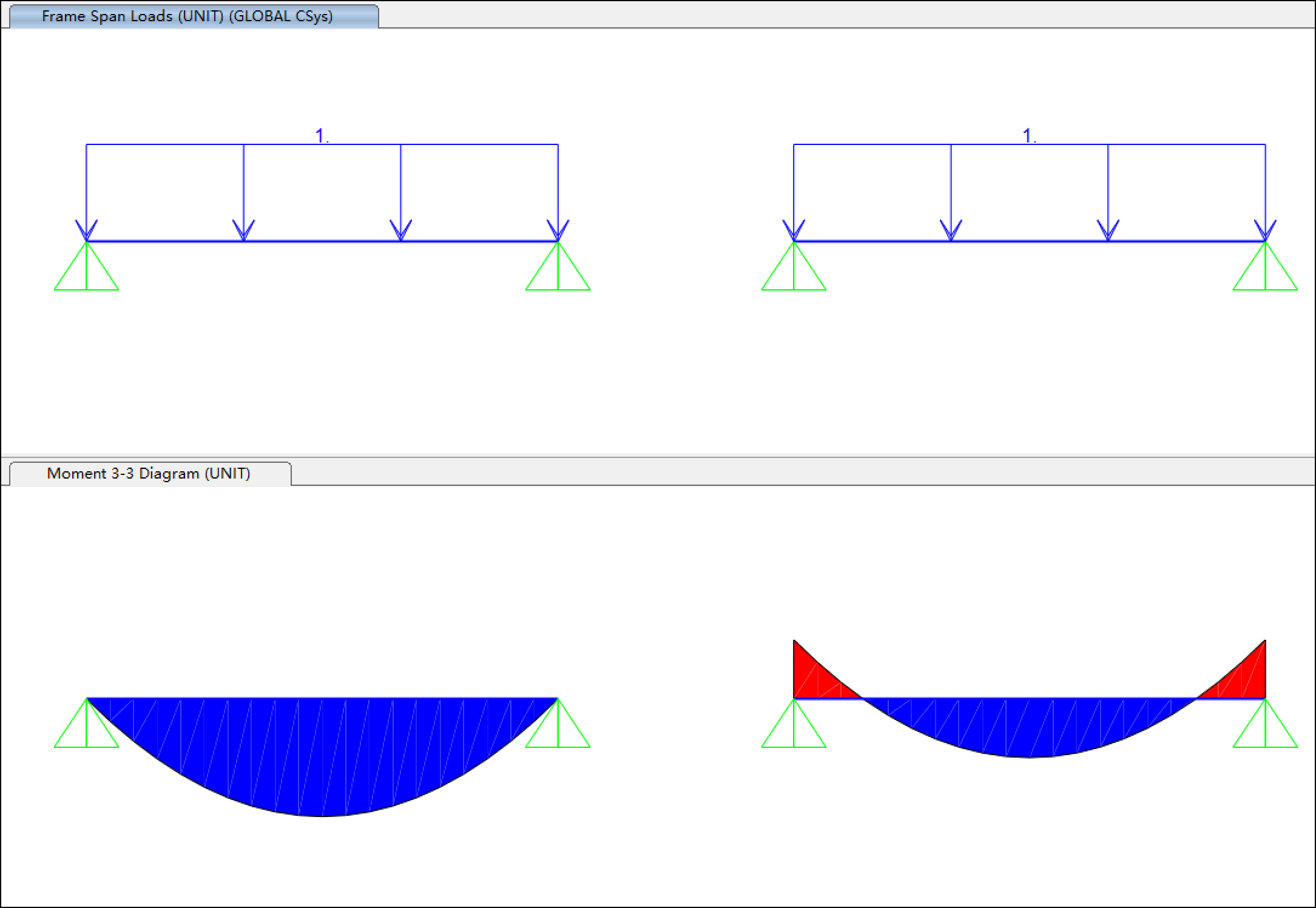 右側(cè)簡支梁支座處的負(fù)彎矩,是由框架對象的插入點剛度選項引起的。框架對象的插入點常用于模擬梁柱構(gòu)件的偏心連接或偏心加載。