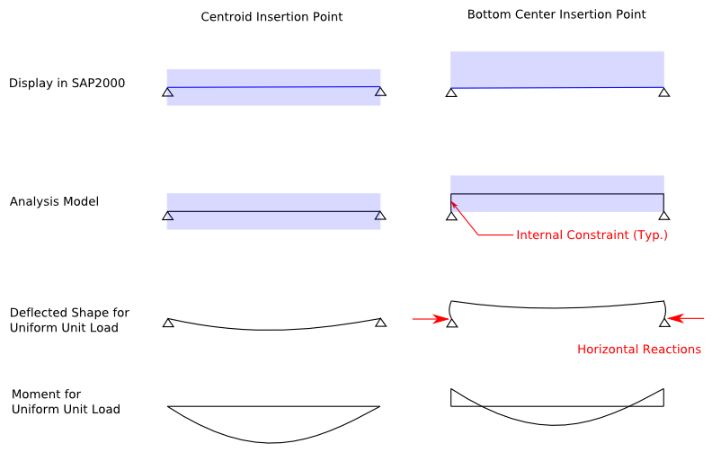 改變插入點不會影響構(gòu)件軸線的幾何位置,但力的傳遞位置會發(fā)生改變。程序內(nèi)部在默認(rèn)插入點和新插入點之間建立類似剛性桿的等效約束,如圖5所示。在右側(cè)簡支梁中,支座提供的水平約束力通過剛性桿傳遞至截面形心,由此產(chǎn)生了支座處的負(fù)彎矩。