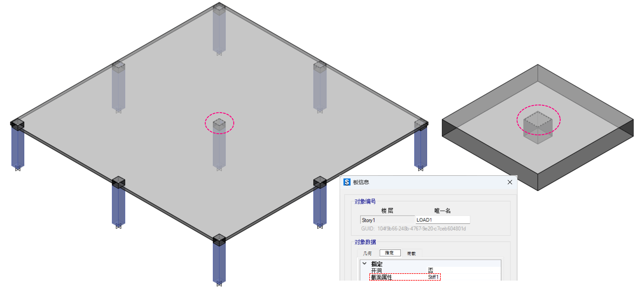 在無梁樓蓋或基礎模型中,柱上或柱底通常會包含類型為Stiff的面對象,如圖1所示。該面對象的含義是什么?它對計算結果有何影響?如何生成?