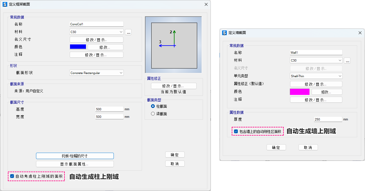 圖3 定義柱或墻截面時自動包含剛域