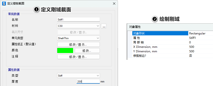 首先,通過【定義>截面屬性>樓板屬性】命令定義剛域,類型選擇Stiff。在無梁樓蓋中,剛域厚度通常應與樓板或托板的厚度一致;在基礎結構中,應與基礎厚度相同。當模型中存在不同厚度的樓板/托板/基礎時,應分別定義相應厚度的剛域,以確保建模精度。