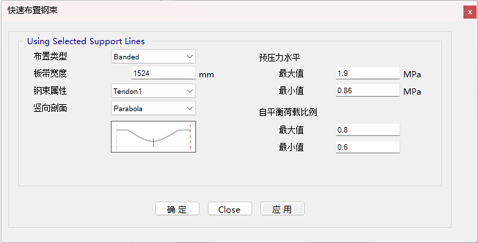 在確定支座位置后,程序會自動讀取各跨的跨度。對于每一跨,鋼束線形根據所選的豎向剖面類型(拋物線或反拋物線)自動生成,并同時滿足結構高度相關的幾何約束條件。