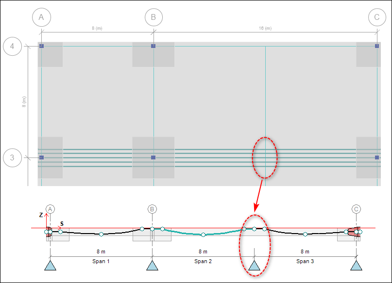 注意:無論是基于支承線還是基于設計板帶自動生成鋼束,如果希望某一交點被識別為支座,則與支承線或設計板帶相交的設計板帶必須設置為柱上板帶(Column Strip);跨中板帶(Middle