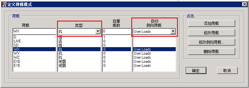 1.通過(guò)命令定義>荷載模式,打開(kāi)定義荷載模式對(duì)話框。在該對(duì)話框的荷載編輯框輸入一個(gè)名稱,在類型編輯框中選擇風(fēng),會(huì)激活自動(dòng)側(cè)向荷載下拉列表。在該下拉列表中選擇User Loads,點(diǎn)擊添加荷載按鈕就會(huì)增加一個(gè)自定義風(fēng)荷載的荷載模式。