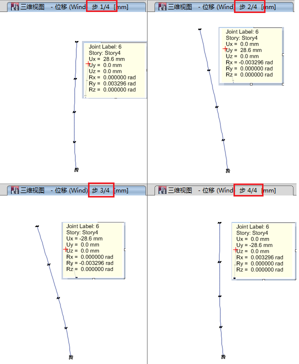下圖以四個(gè)風(fēng)向角的情況(分別對(duì)應(yīng)正負(fù)X軸、正負(fù)Y軸的風(fēng)荷載)為例,說(shuō)明該工況各方向的結(jié)果并不疊加。