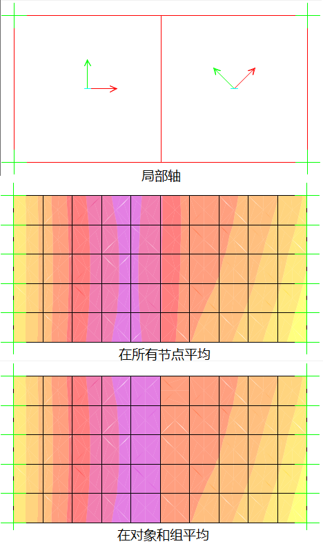 注:在兩個(gè)對(duì)象局部軸不一致時(shí),即使其公共節(jié)點(diǎn)的應(yīng)力狀態(tài)完全相同,但由于應(yīng)力結(jié)果是對(duì)不同坐標(biāo)方向的投影,所以最終的應(yīng)力結(jié)果也應(yīng)該是突變的。