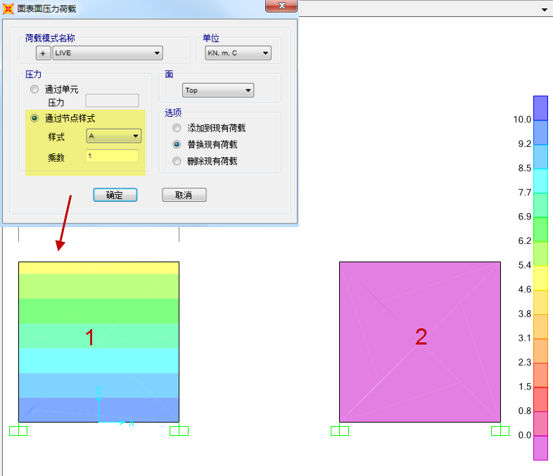 如下圖1所示,兩個(gè)相同的面對(duì)象1、2,均對(duì)其節(jié)點(diǎn)指定相同的節(jié)點(diǎn)樣式。不同的是,將面對(duì)象1的節(jié)點(diǎn)樣式值應(yīng)用到指定表面壓力荷載中,而面對(duì)象2并未做上述操作,如圖2所示。
