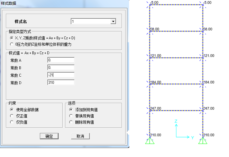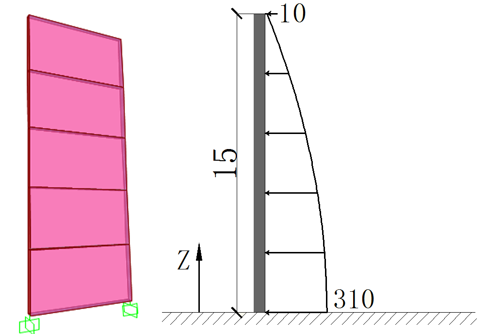 下面以對(duì)某墻(層高3m,共5層)體施加非線性分布(二次函數(shù)P(Z)=-4/3Z2+310)的表面壓力荷載為例,如下圖1所示,說(shuō)明借助交互式數(shù)據(jù)庫(kù)編輯修改節(jié)點(diǎn)樣式值,實(shí)現(xiàn)非線性荷載施加的具體操作方法。
