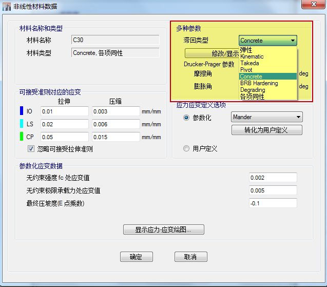 ETABS中提供了多種滯回類型,用于模擬材料、塑性鉸或連接單元的非線性屬性。例如,定義非線性材料數(shù)據(jù)對話框中圖1所示,可選擇不同的滯回模型。