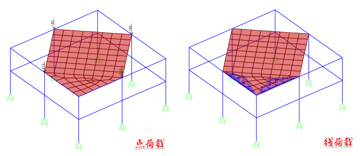 第二,如果三角形或四邊形的邊上 不 存 在 框架對(duì)象,上述線荷載將以靜力等效的原則轉(zhuǎn)換為節(jié)點(diǎn)荷載,施加在三角形或四邊形的角節(jié)點(diǎn)上。