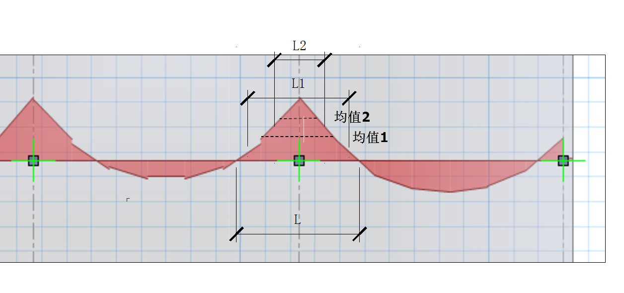 程序基于用戶輸入的【最大平均寬度】對配筋結果進行平均。具體而言,如圖1所示板內力示意圖,L為內力同號區(qū)域寬度(以負彎矩為例),L1、L2為用戶設置的最大平均寬度值(L1>L2)。程序對在最大平均寬度范圍內的峰值進行平均,并將得到的平均值指定給同號范圍(L)內所有的單元。同時可以看出,【最大平均寬度】取值越小,得到平均值越大。